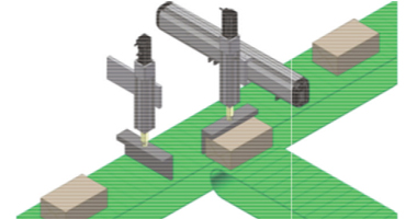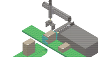 利用單軸電動滑臺組合成XY機構,在輸送帶上方執行物品的搬運作業。