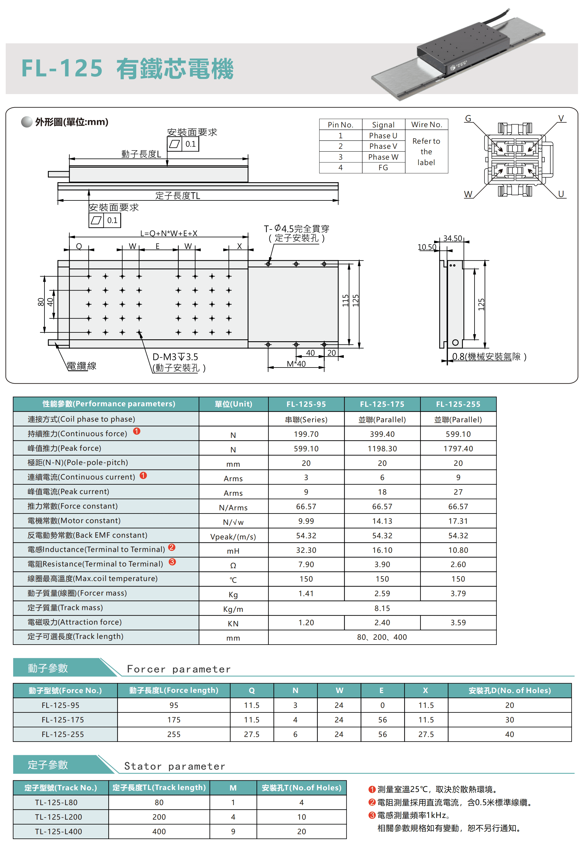 FL系列為有鐵芯直線電機,單位體積最大推力,結構小巧緊湊,低吸力,適應于對馬達推力要求較高的應用。